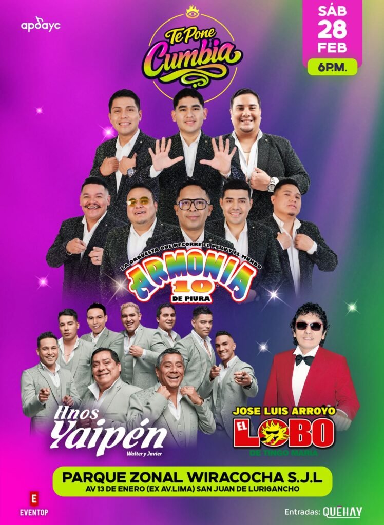 Este sábado 28 de febrero, el Parque Zonal Wiracocha en San Juan de Lurigancho se convertirá en el epicentro de la cumbia con el esperado festival «Te Pone Cumbia». El evento, que iniciará a las 6:00 p.m., promete una noche inolvidable con una cartelera de lujo que incluye a las agrupaciones más emblemáticas del género.