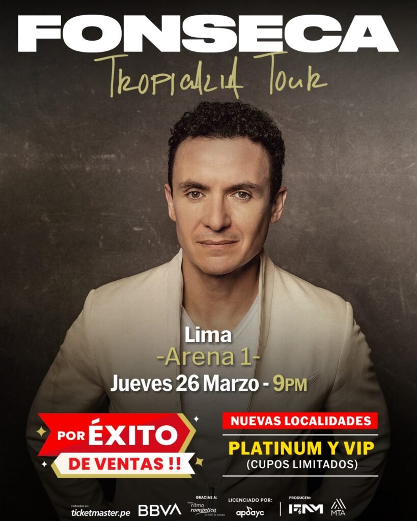 La conexión de Fonseca con el público peruano vuelve a sentirse más fuerte que nunca. Debido al rotundo éxito en ventas se confirma la apertura de nuevas localidades para su esperado concierto en Lima como parte de su gira Tropicalia Tour, este jueves 26 de marzo de 2026 en Arena 1. Las nuevas zonas Platinum y VIP, con cupos limitados, ya se encuentran disponibles a través de Ticketmaster.