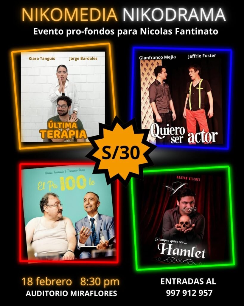 Actores y amigos se unen en NIKODEMIA | NIKODRAMA para presentar cuatro microobras: Última Terapia, Quiero ser actor, El Pa100te, Siempre quise ser… Hamlet. NIKODEMIA | NIKODRAMA, son cuatro microobras y una única fecha, miércoles 18 de febrero a las 8:30 p. m., en el Auditorio Miraflores Av. Larco 1150, sótano. Venta de entradas al Yape 997 912 957 (Indicar su nombre en el mismo yape).
