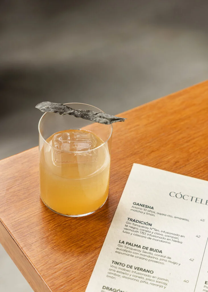 Entre los cócteles de autor se encuentra La Palma de Buda, una mezcla de Gin Tanqueray Sevilla, cordial de eucalipto con mandarina, pino mugo y espumante cinzano proseco, Empire Coffee, que combina Vodka Absolut, degollador, cold brew, miel de maple y espuma crítica, y Dragón Ryujin, solución cítrica con Black Whiskey, aqara rito y jarabe de kion con pitahaya.