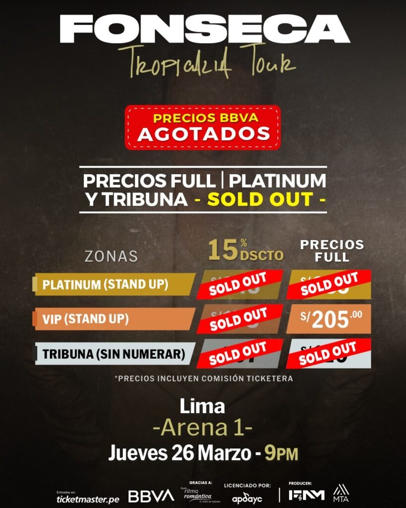 Lima confirma su entusiasmo por Fonseca. Las entradas para las zonas Platinum y Tribuna ya se encuentran totalmente agotadas, y solo quedan las últimas localidades disponibles en Ticketmaster para la zona VIP del esperado concierto de su gira Tropicalia Tour este jueves 26 de marzo de 2026 en Arena 1. Un éxito rotundo de ventas que anticipa una noche inolvidable de alegría, ritmo y romance.